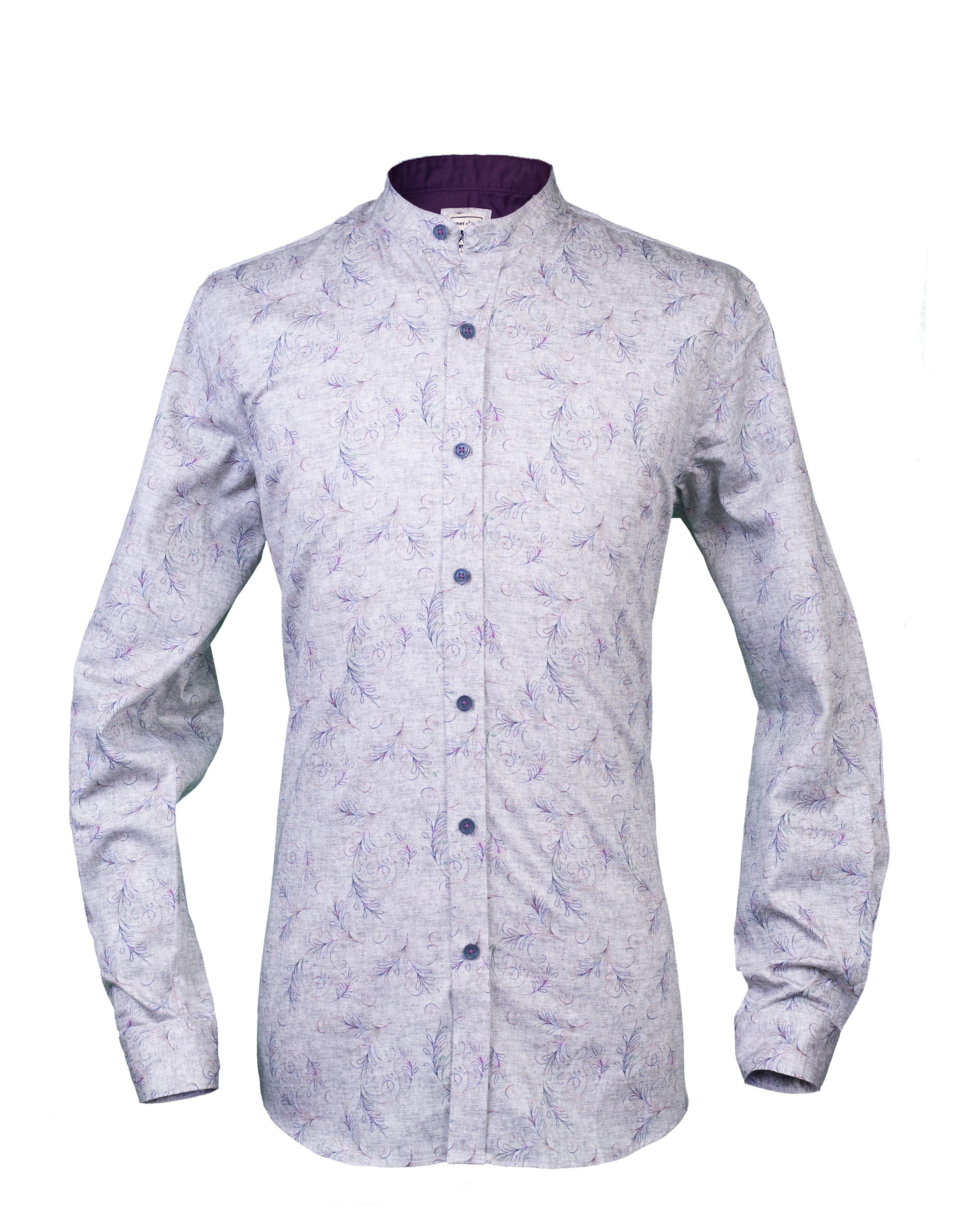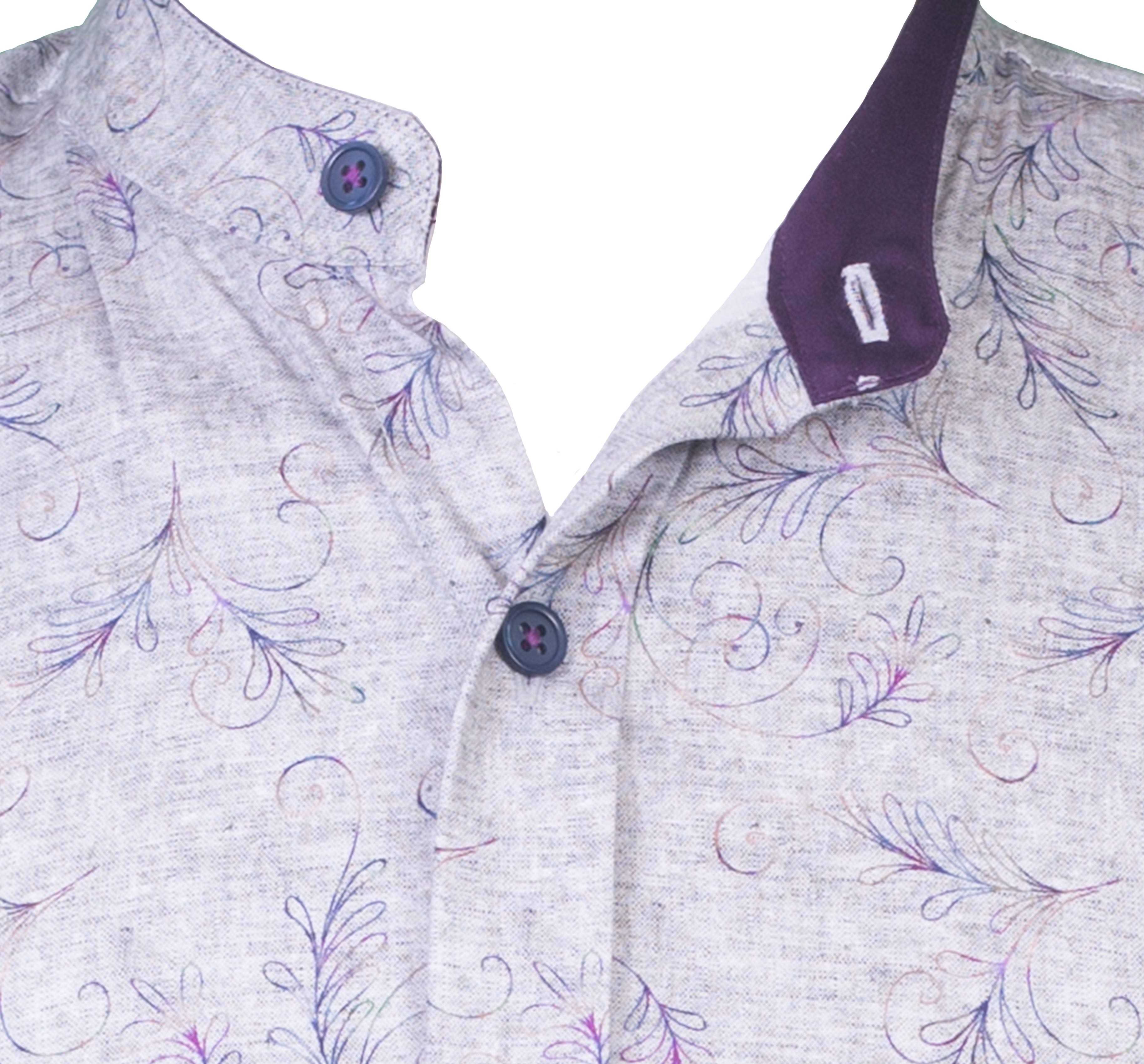 Grå med tryckt blad mönster . Kontrastfärg insida krage med lila. Murar krage .